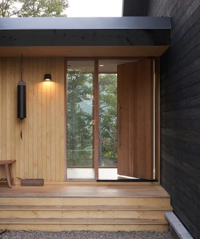 這所房子用了兩層木墻板,主要的壁板是Accoya,采用拉絲燒杉板飾面完成。這種傳統的日本處理方法是通過炭化來保存木材,木板嚴重燒焦的表面使木材阻燃以及抗腐防蟲,該材料被選為主要壁板,也因為它的低維護性和自然黑暗的外觀。