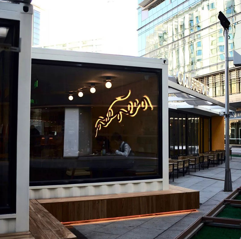 整個餐廳構造由6個集裝箱組裝而成的,因地就勢、造型新穎獨特,占地面積小,前庭后院,提供豐富的戶內外空間。無論是白天還是夜晚,都有著濃郁的時尚現代氛圍。全景落地玻璃,讓就餐的人與街邊路人互為風景,讓人有種仿佛在倫敦街邊的餐館吃飯的感覺。午后,給自己一個空閑,在戶外喝上一杯香醇濃郁的咖啡或一杯桑格麗雅,滿滿的正能量繼續投入工作。