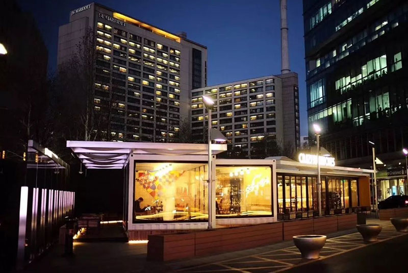 夜幕降臨,華燈初上,低調收斂的它與周圍的商業氛圍完美的結合在一起,互為映襯。晚上,才是狂歡的開始。集裝箱餐廳的燈光透過大玻璃窗照射到窗外,將整個餐廳的氛圍渲染到極致。白天還是個優雅的西餐廳,晚上則華麗麗的轉身為一個小酒吧。每一次的小邂逅都在不經意間發生,唯有身臨其境......