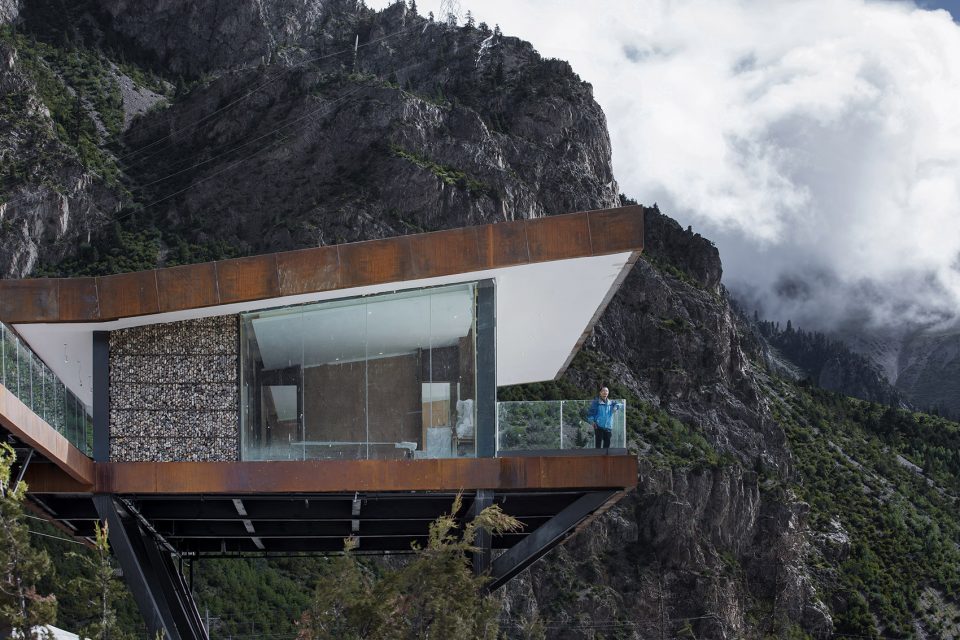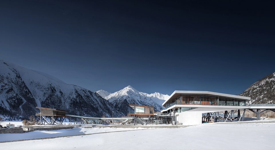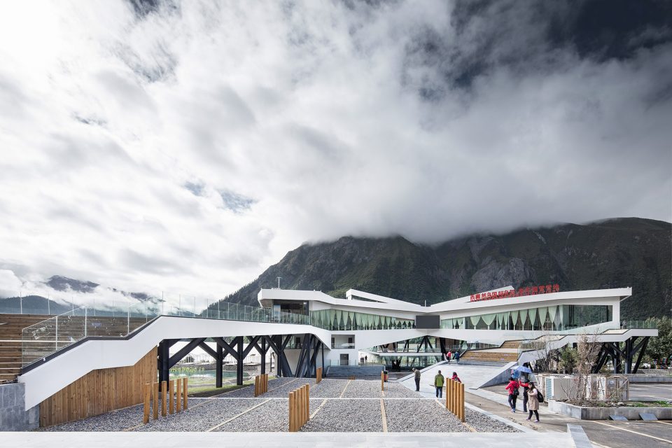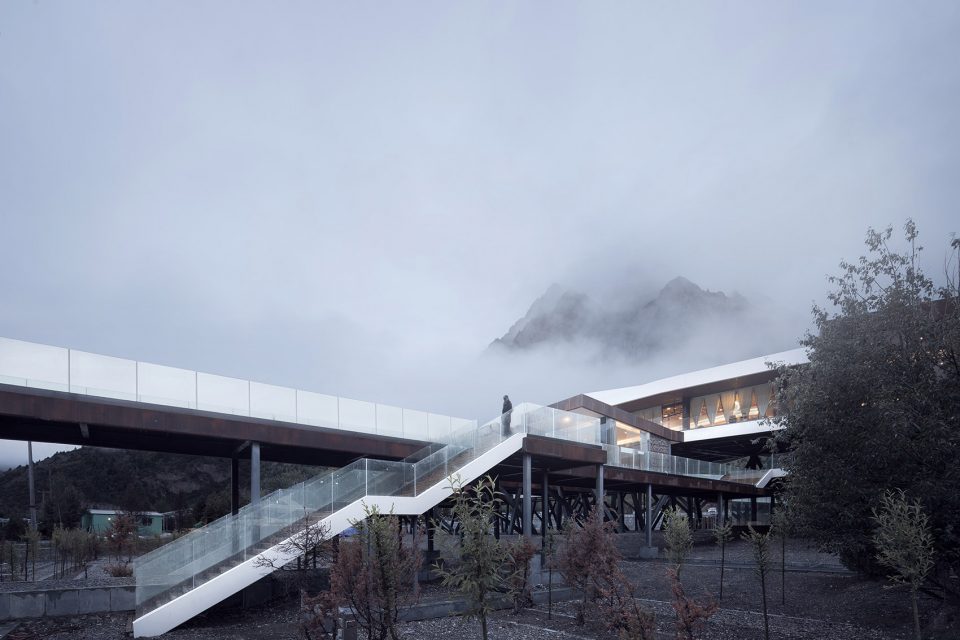 項目建筑以藏民族所喜愛和崇尚的白色、紅色為主色調,通過白色水泥纖維板、紅色耐候鋼板、超厚透明玻璃、深灰色鋼材、當地木材及當地卵石等材料巧妙搭配,共同營造一個獨特、自然、溫馨、別致的空間環境。