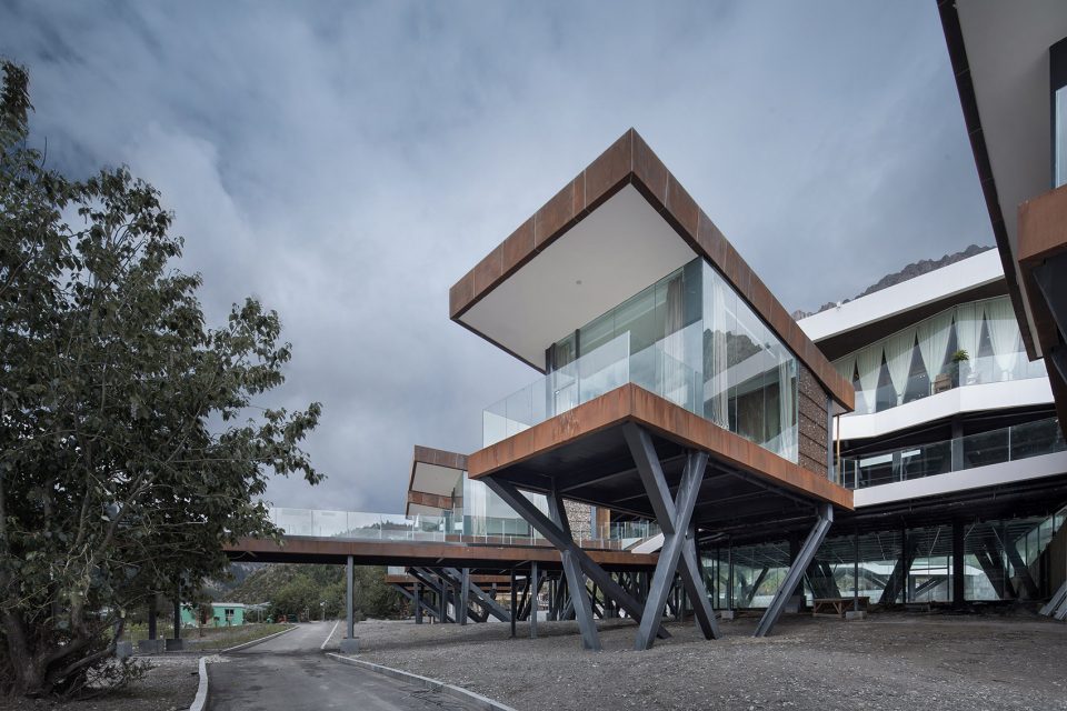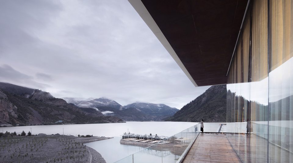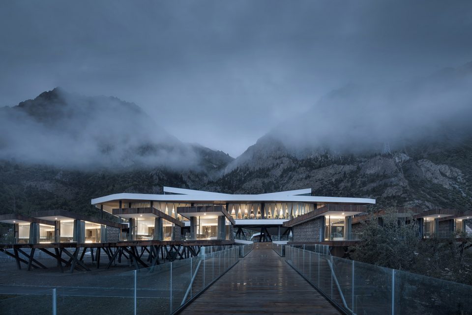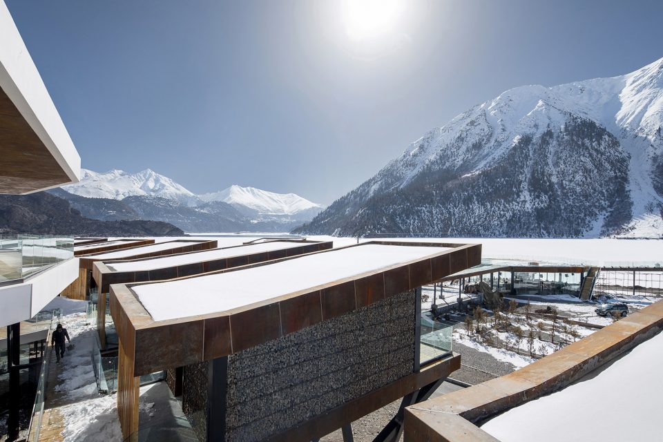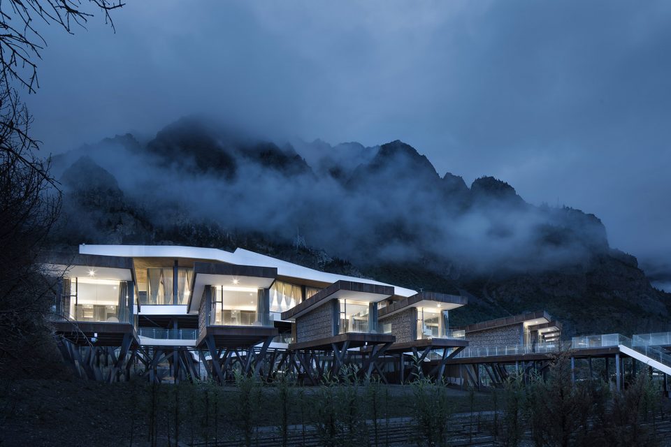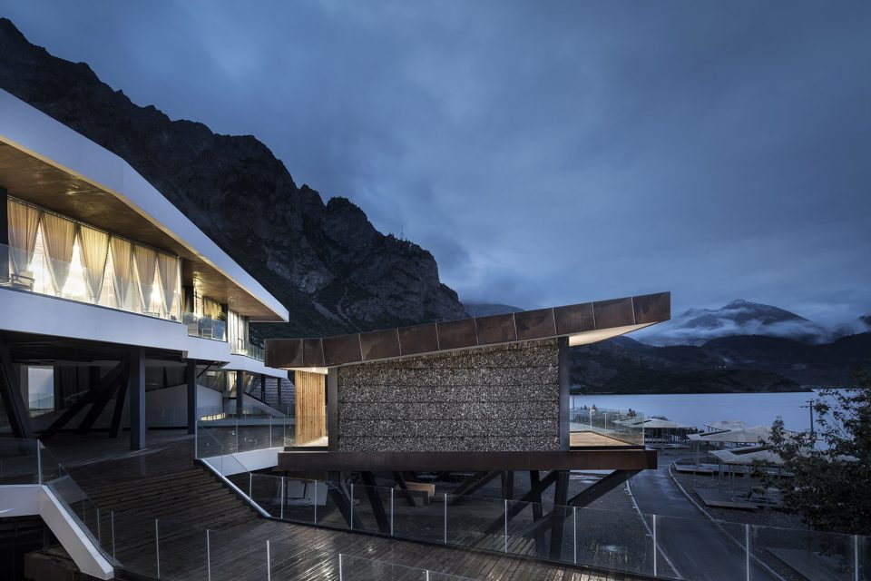 主體建筑前方點綴了8棟獨棟式度假酒店,酒店底部架空2-4米,根據視線需求高低錯落布置,且控制酒店屋頂高度均低于旅游服務中心一層1.5米以上,保證酒店客房**景觀視野和客房相互間私密性的同時,亦可保證旅游服務中心優越的臨湖景觀視野。酒店客房西側為當地卵石制作的特色景觀墻,臨湖東南兩側均為4米高180°超寬落地玻璃窗,躺在床上然烏湖巍峨俊秀的雪山、滿天繁星的夜空即可盡收眼底。