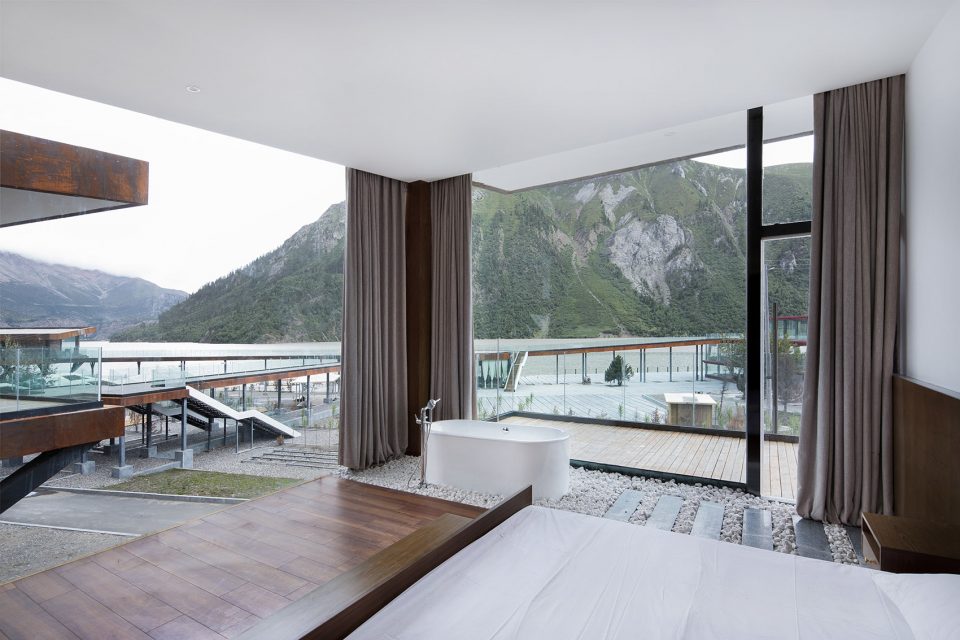 為更好地利用然烏湖的水位變化,套房酒店底部架空約4米,然烏湖枯水期酒店掩于水草叢生,然烏湖豐水期酒店漂于波光之上,游于薄霧之間……“面朝大海,春暖花開”,這是多少人所向往的生活呀!
