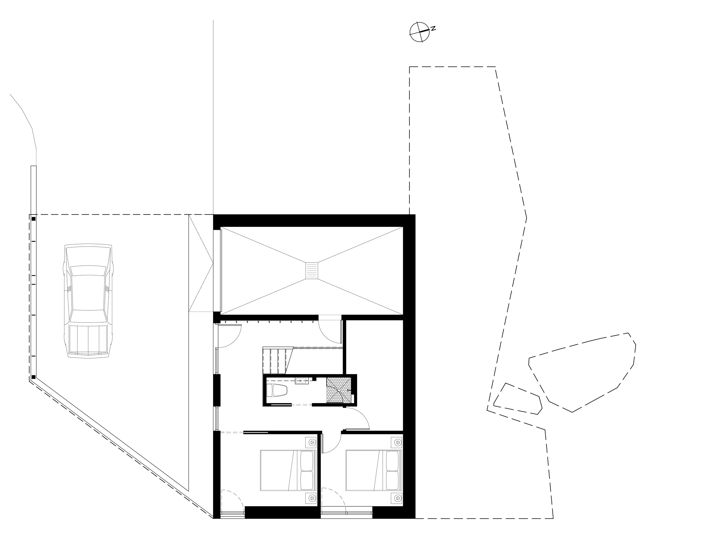 經過懸挑空間,通過前門可以到達兩間客臥和一間浴室,一間儲藏室,以及通往主要生活區域的木質樓梯。